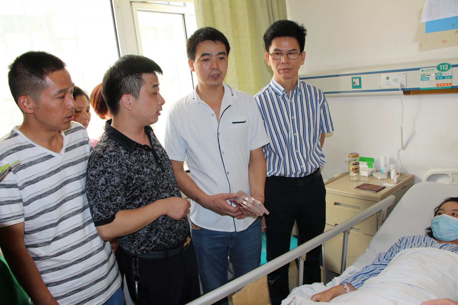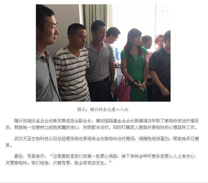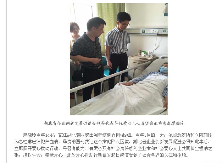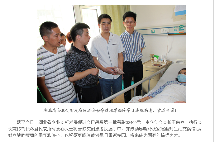 2015年8月6日,董事長熊善清代表博安國苗助學(xué)基金,來到武漢市協(xié)和醫(yī)院探望羅田河鋪雙鳳坳中學(xué)14歲的白血病學(xué)生廖曉玲,給患病的孩子和家庭送去善款和社會各界的關(guān)愛。