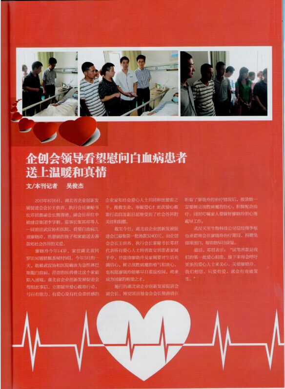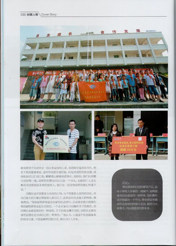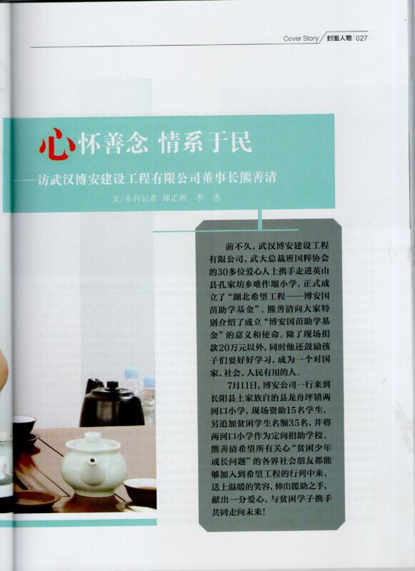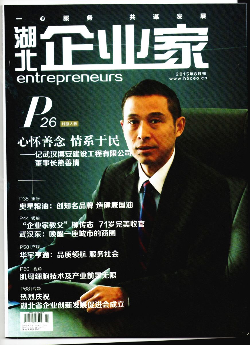 公司董事長熊善清榮登《湖北企業(yè)家雜志》2015年8月刊封面人物,其中,重點報道了博安國苗助學(xué)基金倡議發(fā)起的捐資助學(xué)活動。慈善事業(yè)功在當(dāng)代,立在千秋,常懷善念,心系于民是辦好企業(yè)的根本。