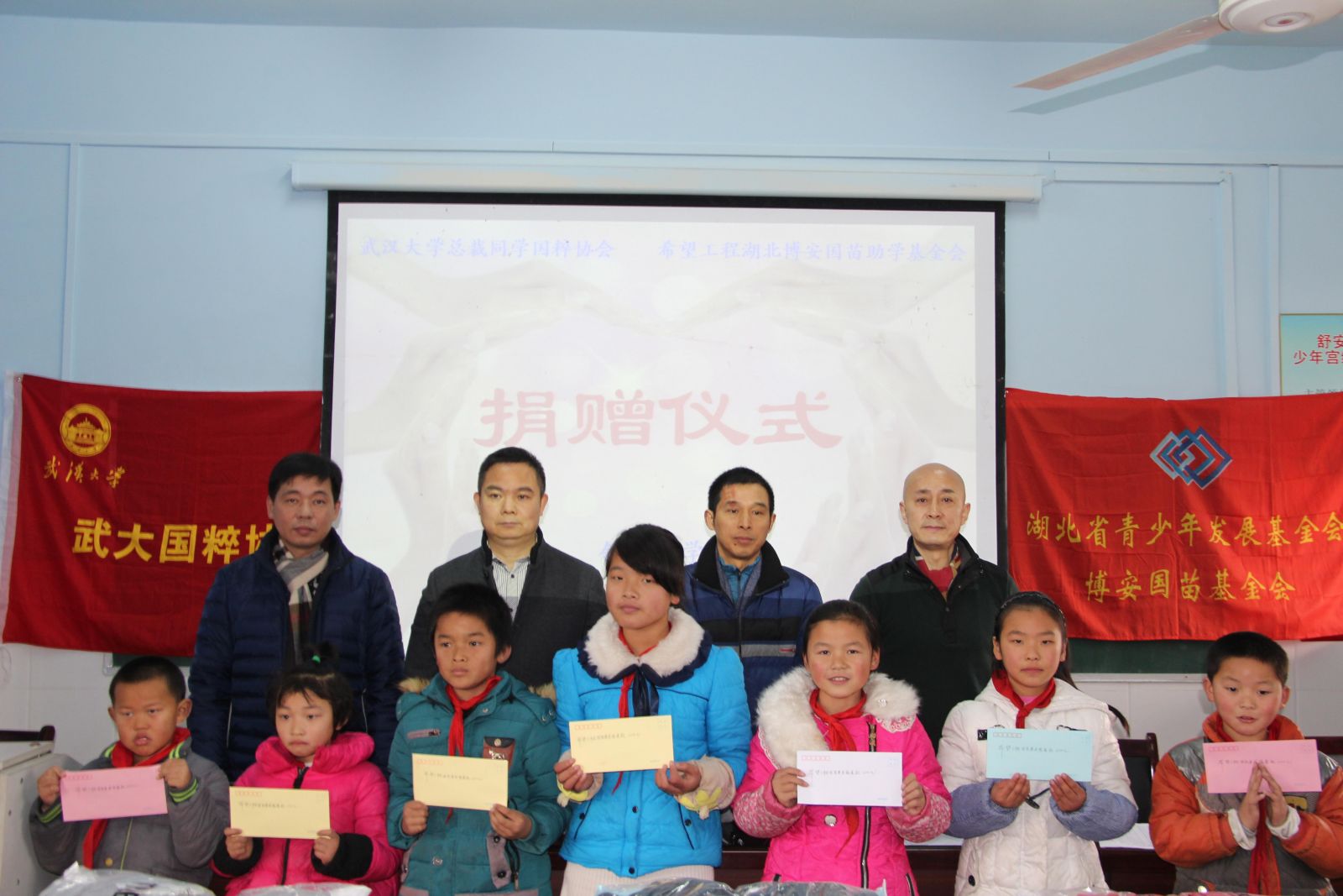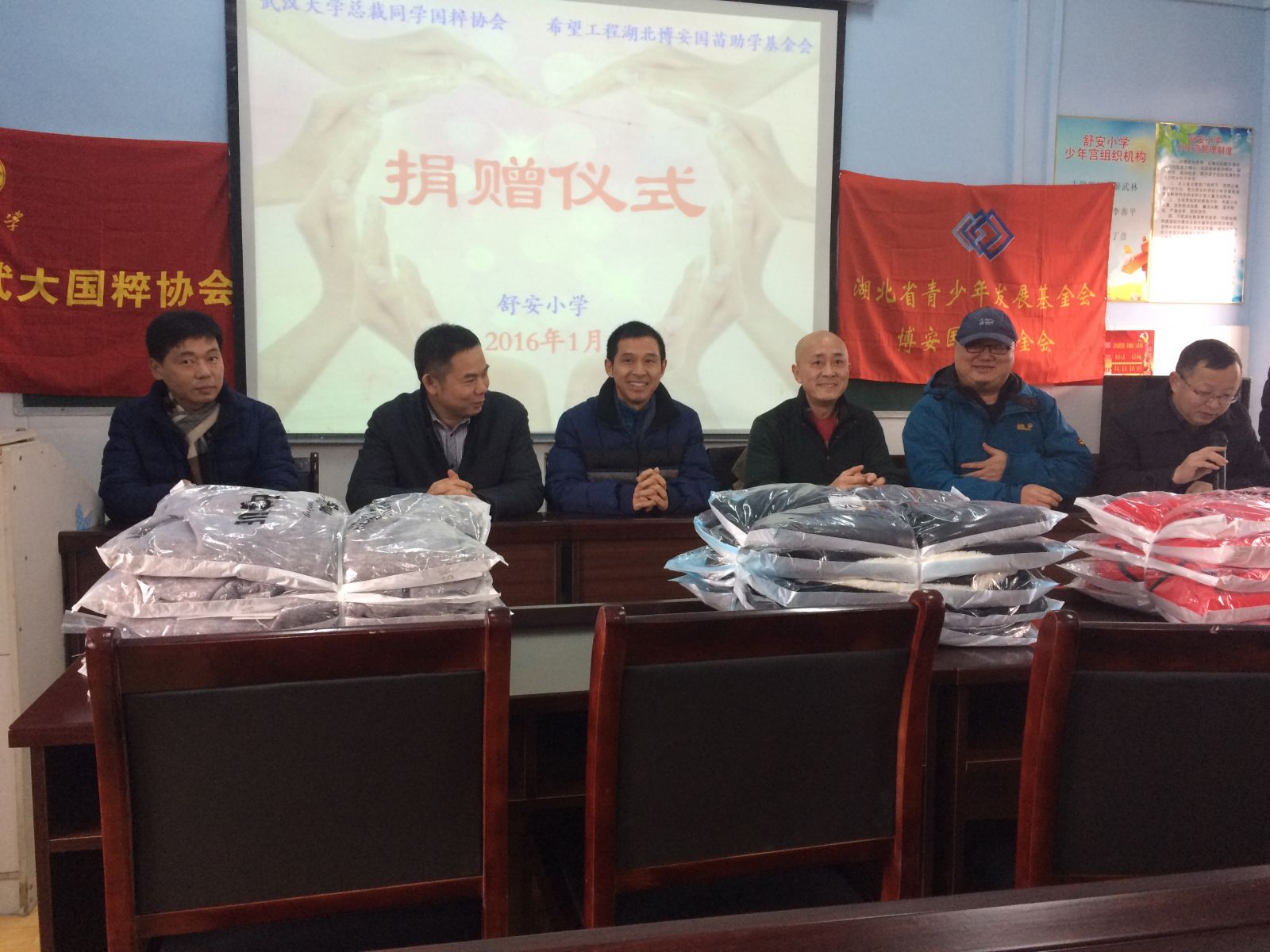 2016年1月6日,湖北希望工程·博安國苗助學(xué)基金會、武大總裁同學(xué)會國粹協(xié)會在武漢市江夏區(qū)舒安小學(xué)舉行了關(guān)愛困難學(xué)生“送春風(fēng)·送溫暖”的助學(xué)捐贈(zèng)儀式。江夏區(qū)舒安街街道辦事處領(lǐng)導(dǎo)、舒安鄉(xiāng)教育局相關(guān)領(lǐng)導(dǎo)出席了捐贈(zèng)儀式。