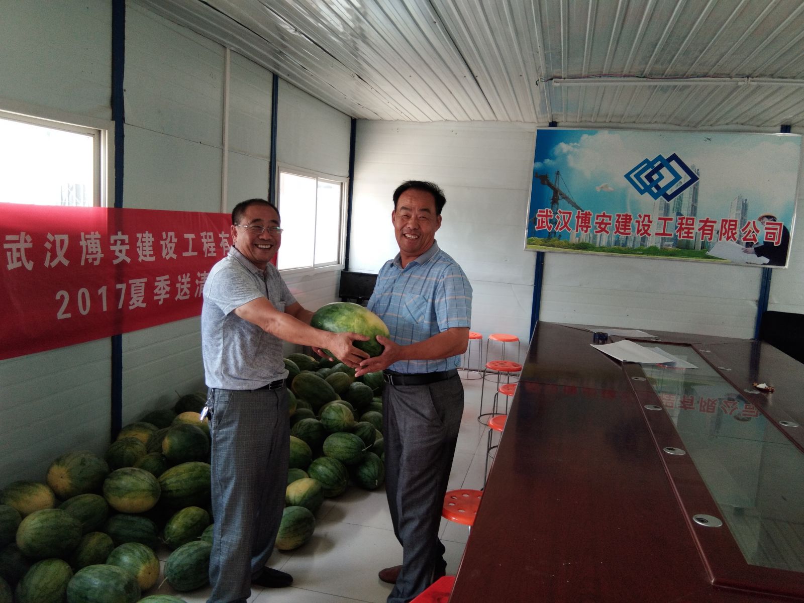 夏日炎炎,驕陽似火。7月中旬,武漢博安建設工程有限公司組織員工代表給各在建項目的員工送清涼的活動??偨?jīng)理助理楊行軍、項目經(jīng)理喻維剛、陳為付等人分別給各個項目部的一線員工送上了西瓜、酸梅膏和花露水、風油精、藿香正氣水等防暑減溫的物資。