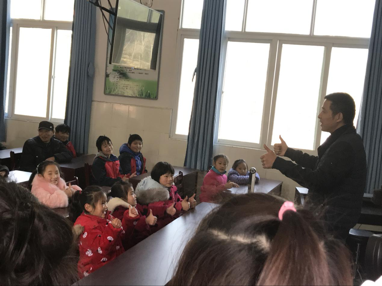 一行人到達(dá)學(xué)校時,方校長熱情接待了我們,正直中午放學(xué)期間,我們等孩子們就完餐,將38名孩子聚集在一起,他們坐在教室里,和武漢的愛心人士一起上了一堂不一樣的課。課堂上,有以為愛心人士和孩子們一起做石頭剪刀布的游戲,雖然一個簡單的小游戲,但是孩子們卻從中收到了快樂和溫暖。講臺下坐著都都是留守兒童,性格比較內(nèi)向害羞,博安國苗助學(xué)基金熊善清理事長鼓勵他們他們站上講臺,大膽地表達(dá)自己。還親身的跟孩子們做為自己點(diǎn)贊的動作來鼓勵他們。這樣一來,孩子們和愛心人士的心拉得更近了,孩子們臉上也笑開了花。其實對于這群孩子們來說,一個關(guān)切的眼神,一個簡單的互動,就能讓他們感受到溫暖和快樂。