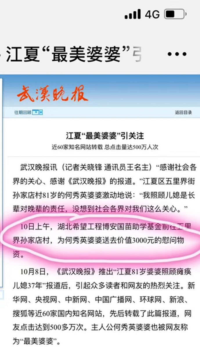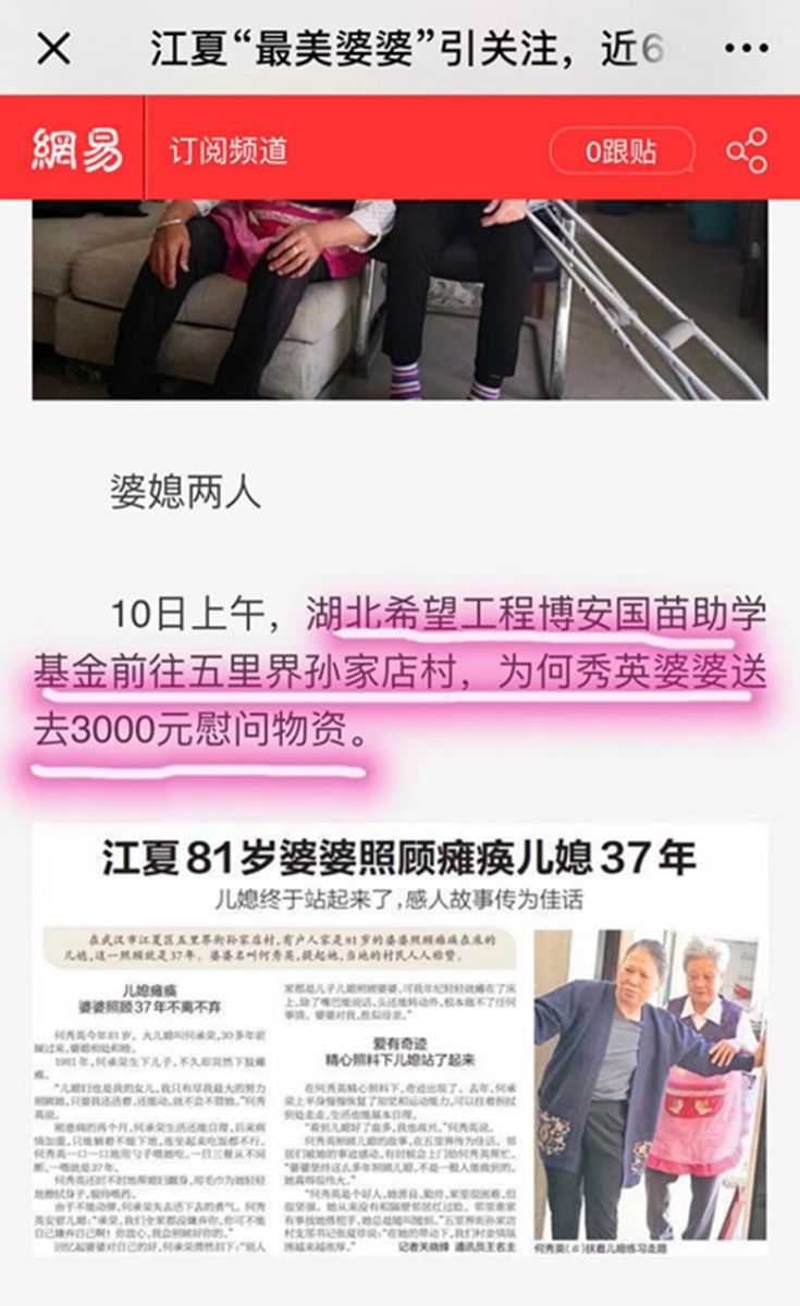 武漢好婆婆!照顧癱瘓兒媳37年,兒媳奇跡般站起來!新華網(wǎng)、央視網(wǎng)、中新網(wǎng)、中國廣播網(wǎng)、環(huán)球網(wǎng)、新浪、搜狐等近60家國內知名網(wǎng)站關注了這位好婆婆,網(wǎng)友點擊達到500多萬次。何秀英婆婆被網(wǎng)友稱為“最美婆婆”,成為正能量“網(wǎng)紅”。